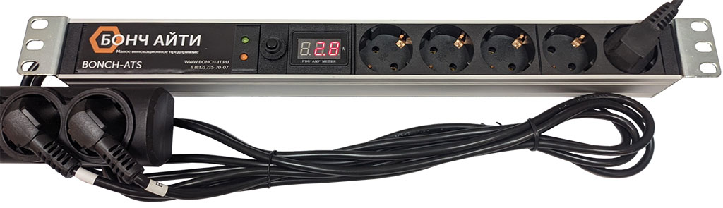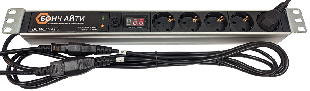 Горизонтальный ПДУ с функцией АВР для стандартного 19 дюймого шкафа имеет 5 розетокSchuko, амперметр и кабели подключения питания длиной 1.7 м. с вилками C14