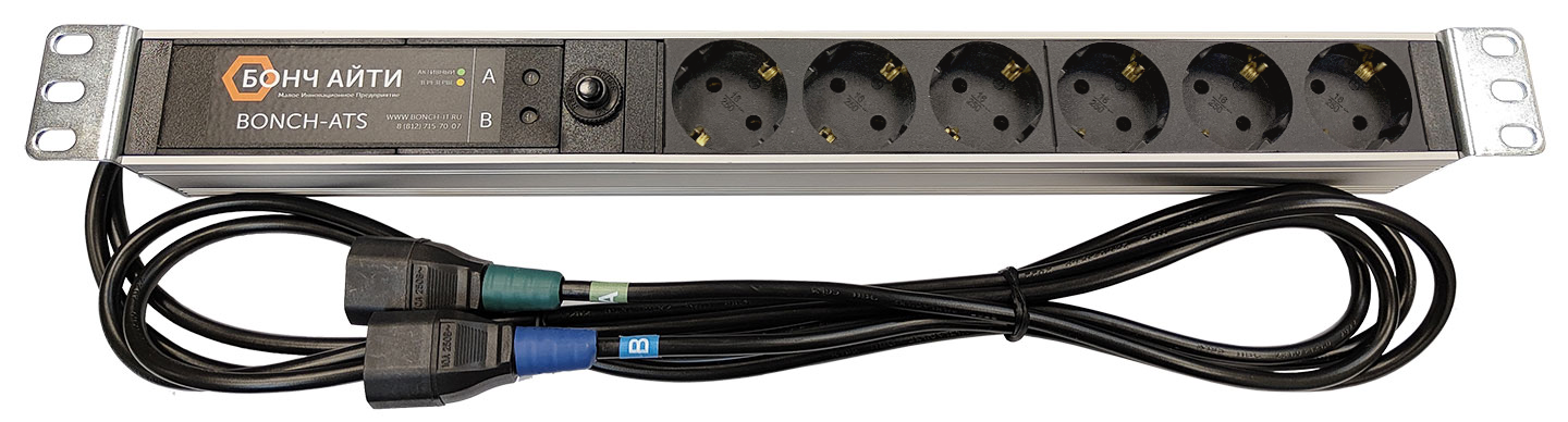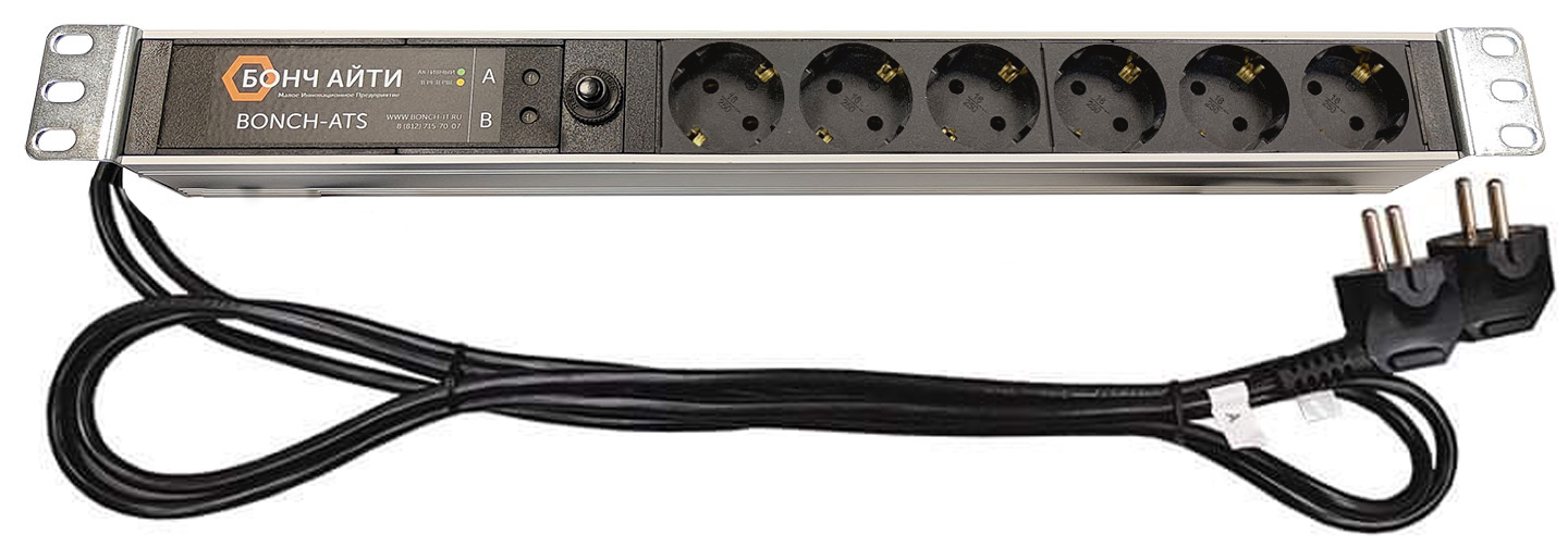 Горизонтальный ПДУ с функцией АВР для стандартного 19 дюймого шкафа имеет 6 розеток Schuko и кабели подключения питания длиной 1.7 м. с двумя вилками C14