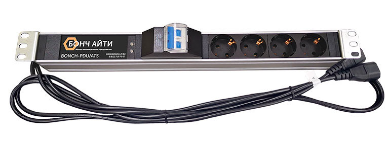 Горизонтальный ПДУ с функцией АВР для стандартного 19 дюймого шкафа имеет 4 розетки Schuko, кабели подключения питания длиной 1.7 м. с разъемами C14 и автомат защиты на 10А (Chint).