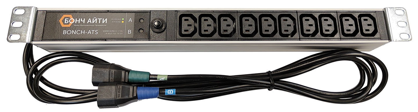 Горизонтальный ПДУ с функцией АВР для стандартного 19 дюймого шкафа имеет 10 розеток С13 и кабели подключения питания длиной 1.7 м. с вилками Shuko