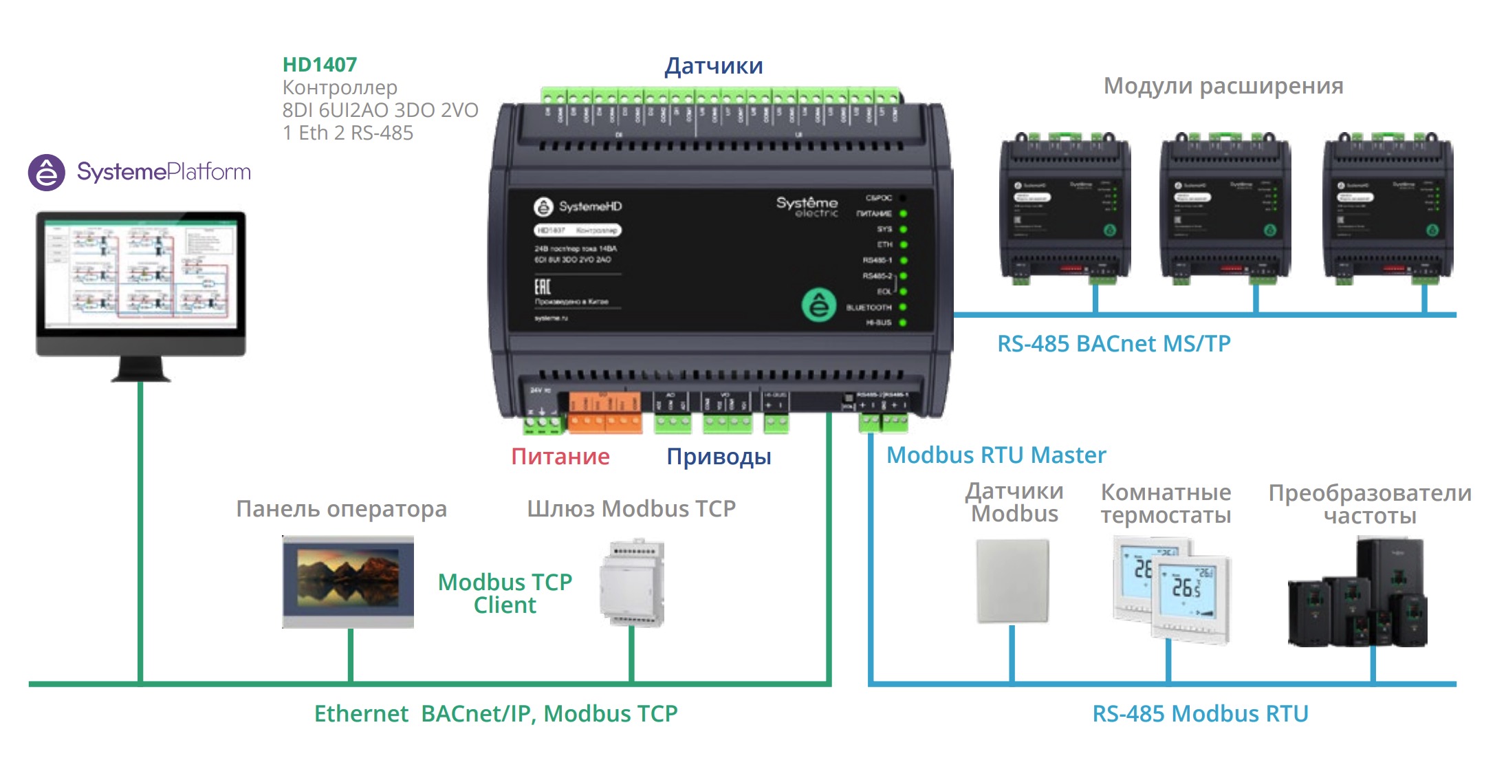 По интерфейсу Ethernet с поддержкой протоколов BACnet IP и Modbus TCP контроллеры SystemeHD взаимодействуют с системой диспетчеризации SystemePlatforn, панелями интерфейса пользователя .SystemeHMI и другими устройствами
