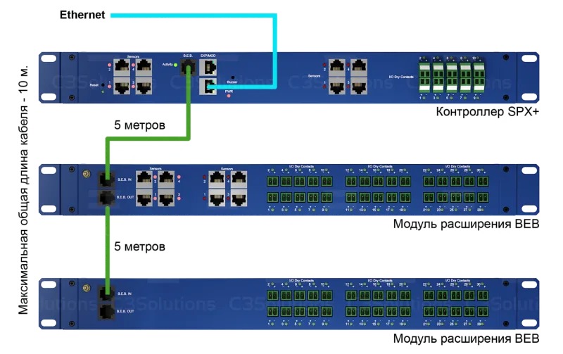- Архитектура расширения SPX+. Контроллеры SPX+ поддерживают подключение модулей расширения. Протокол BEB подходит для расширения на короткие расстояния. Несколько модулей BEB могут быть соединены последовательно, максимальная общая длина соединительного кабеля зависит от количества устройств в цепи: