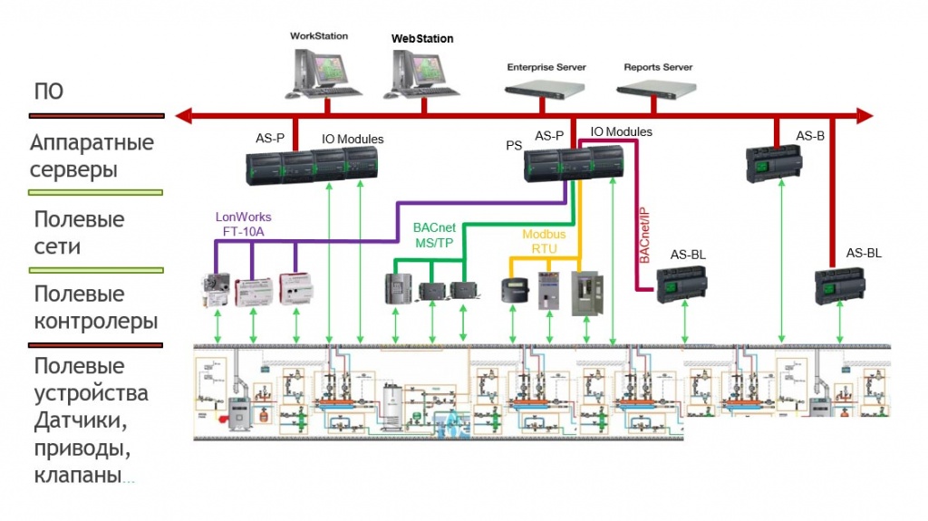 Для системы управления зданиями характерна традиционная трехуровневая структура, состоящая из: