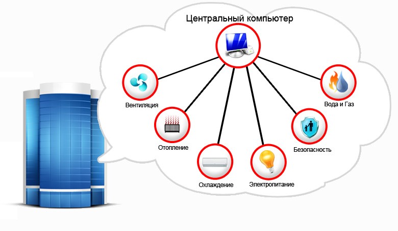 В системе управления современным зданием можно выделить ряд подсистем для управления различными узлами, такими как автоматика ЦТП, коммерческий учет расхода тепла, системы теплоснабжения и котельные, системы холодоснабжения и охладительные машины, канализация и водоснабжение, электроснабжение и гарантированное электропитание, система освещения, дымоудаления и так далее.